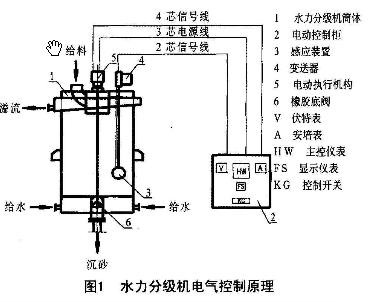 水力分級機和組成:筒體、電動控制柜、感應裝置、變送器、電動執行 、橡膠底閥、伏特表、安培表、主控儀表、s顯示儀表、g控制開關。