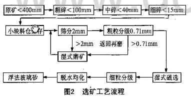 表1產品粒度要求該廠所用析料為石英砂巖,礦山開采送至選廠的原礦石塊粒度為400mm以下,生產加工工藝流程如圖2示。