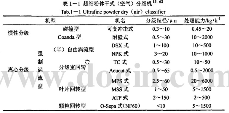 磨礦、分級作業廣泛應用于礦業、建材、化工、冶金、材料等工業領域。就礦物加工領域而言,除個別砂礦外,所有選礦廠都有磨礦分級作業,因此它是最普遍、最通用的生產工序。在選礦廠中磨礦分級作業的基建投資占60%'-"80%。生產費用占選礦成本的50%—70%,因此改進磨礦分級設備和技術具有很大的經濟和社會效益,國內外對此都非常重視。分級是對相同密度的固體顆粒按其粒徑差異做兩種或兩種以上級別的分離,即粒度調整。分級可在重力場中進行,也可在離心力場中進行,其中干法分級機大多采用慣性力場或離心力場的空氣分級機。如表1-1所示。