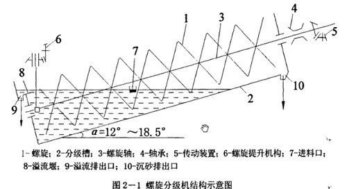 如為雙螺旋,從上部來看螺旋葉片均是向外轉動。礦漿由槽的旁側給入,1-螺旋;2一分級槽;3一螺旋軸;4一軸承;5一傳動裝置;6一螺旋提升 ;7一進料口;8一溢流堰;9一溢流排出口;10-沉砂排出口